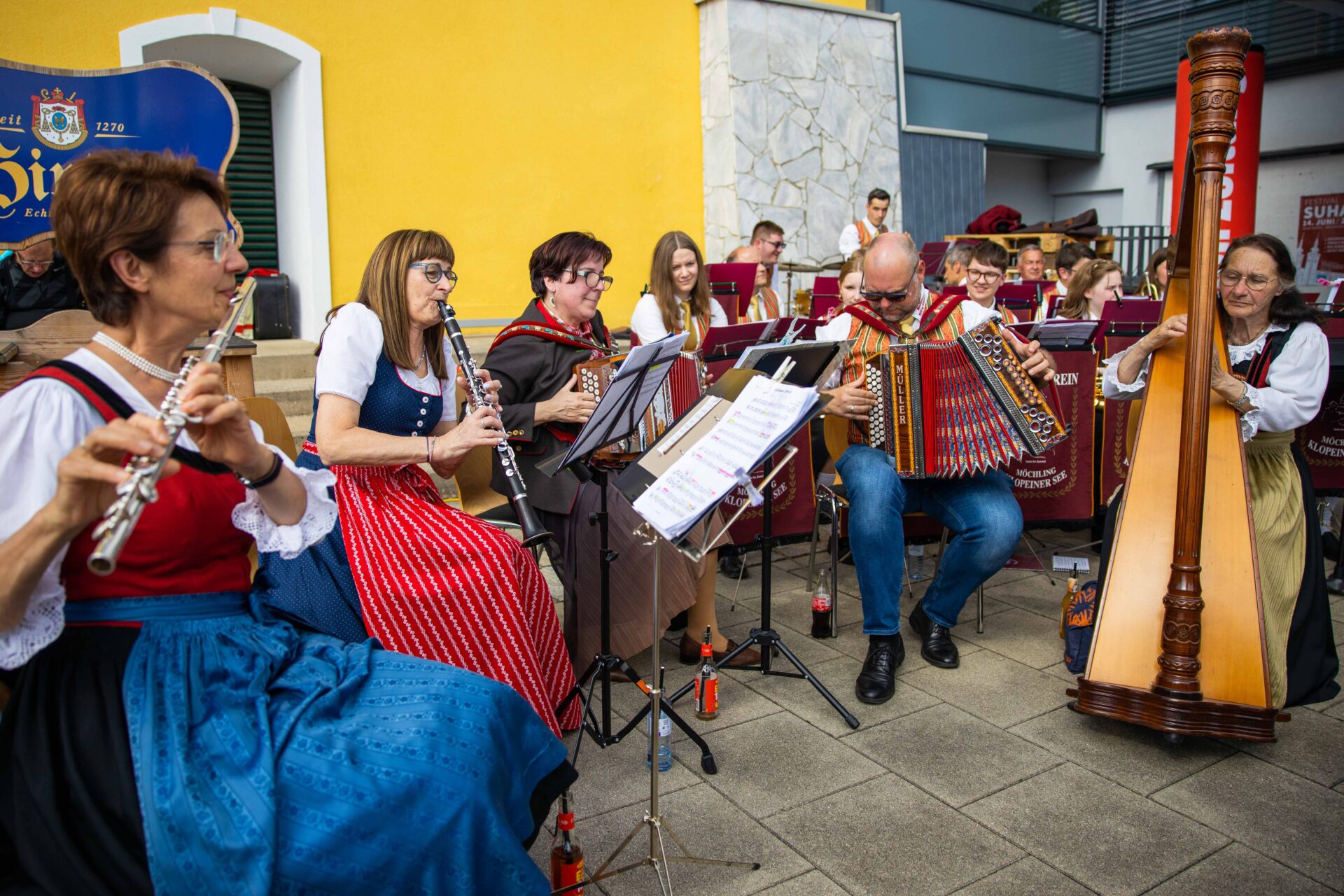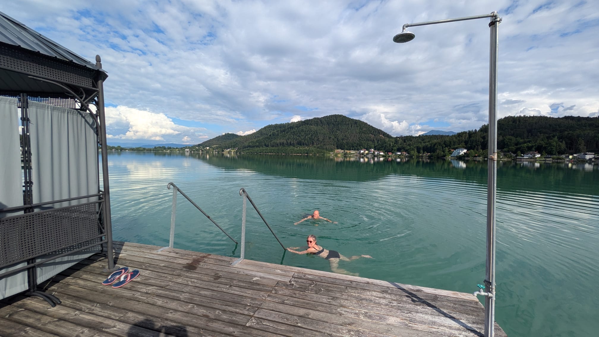 Následovala osamocená stíhačka do Ferlachu s polední pauzou na společně zajištěný oběd. Po něm dál celkem osmdesát kilometrů až ke Klopeinskému jezeru, nejteplejšímu v Alpách. Po dojezdu další bohatá svačina na návsi St. Kanzianu, ubytování na dosah s (jedinou naši letošní) koupačkou v jezeře a pak ještě program s večeří v kulturním domě. Jako nášup se podávala večerní laserová show na jezeře.